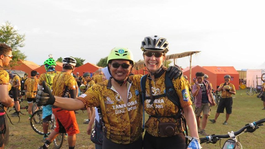 Penulis berfoto bersama istri Konjen Amerika Serikat untuk Indonesia di Surabaya. Kami sama-sama mengikuti touring sepeda Tambora Bike tahun 2015. Foto: Dokumen Pribadi