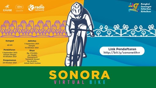JAKARTA—Radio Sonora menggelar lomba gowes virtual dalam rangka Hari Ulang Tahunnya ke-49. Jalur virtual dipilih sebagai upaya beradaptasi dengan wabah virus corona 19 yang belum redah. Aktivitasnya tetap berlangsung dan mematuhi protokol kesehatan. Termasuk melakukan donasi bagi masyarakat yang kurang beruntung.